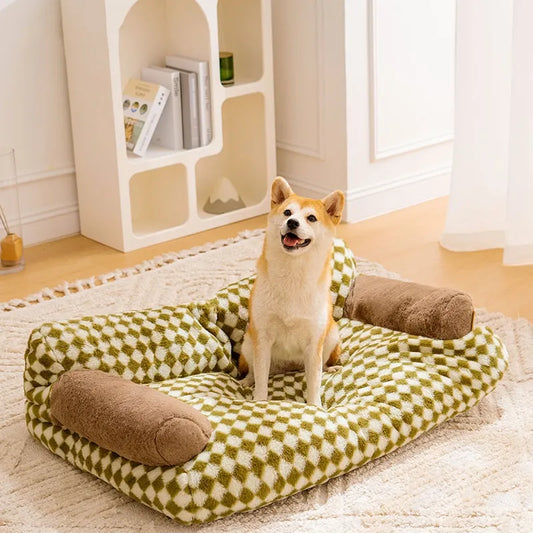 Handmade Plush Chessboard Orthopedic Support Dog Bed with Pillow