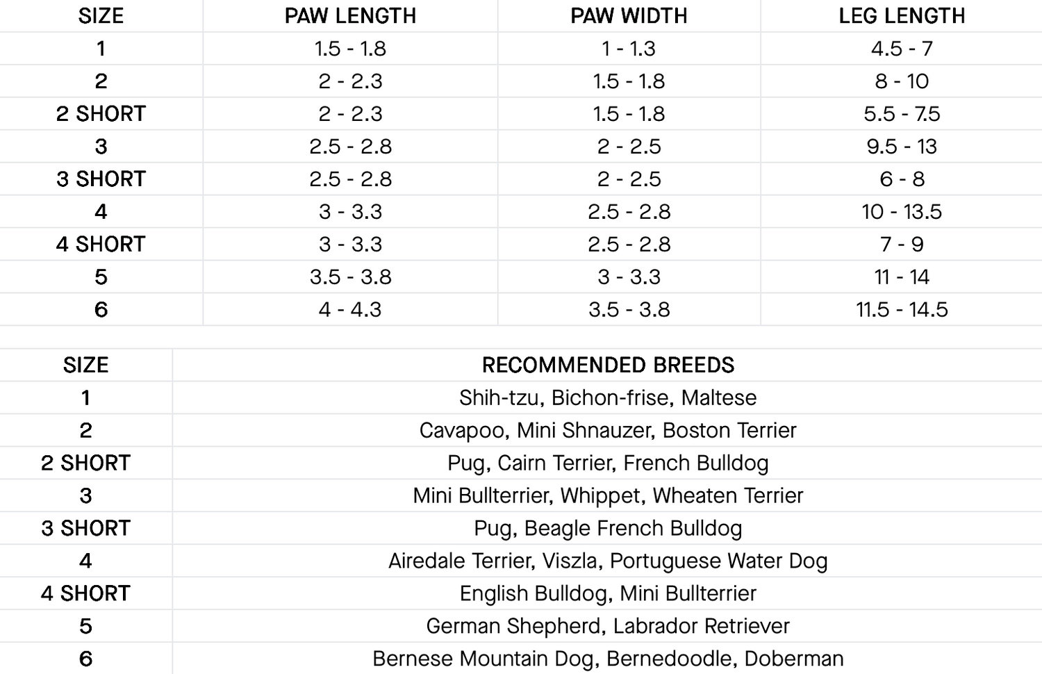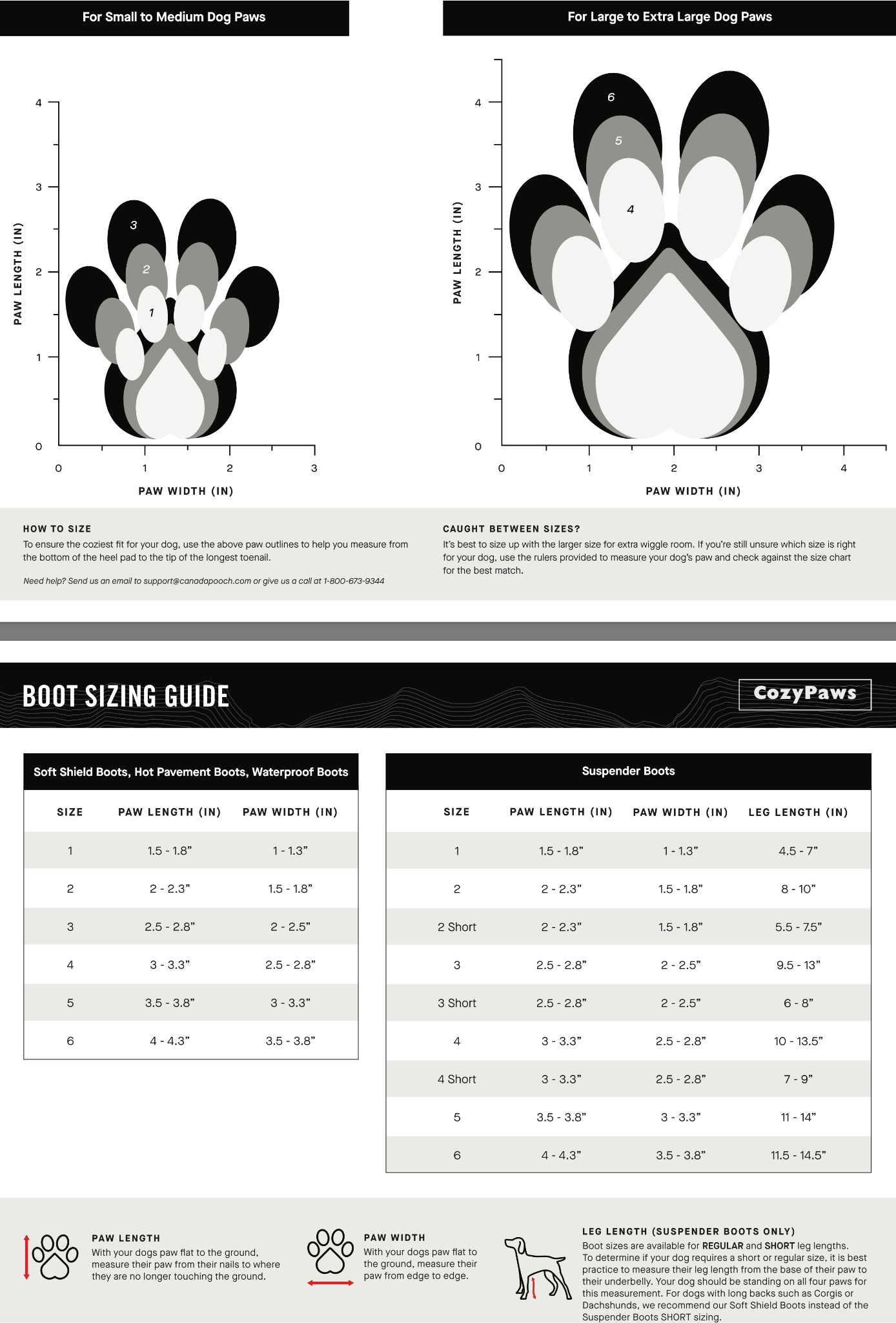 Enter your dog’s paw and leg measurements below to find the ideal boot size. Need help? Click here to print our paw measurement guide.