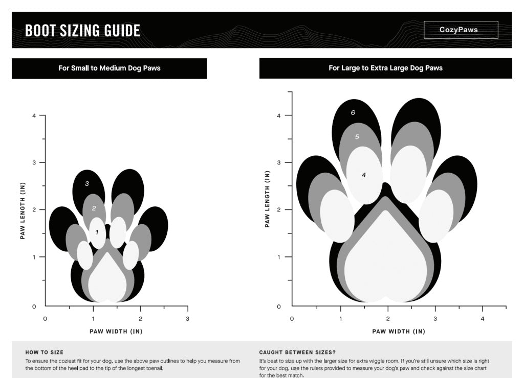 Place your dog’s paw on a piece of paper and gently press down to mimic standing weight. Mark the widest part (paw width) and from heel to longest nail (paw length). Compare the measurements to our Size Chart above.